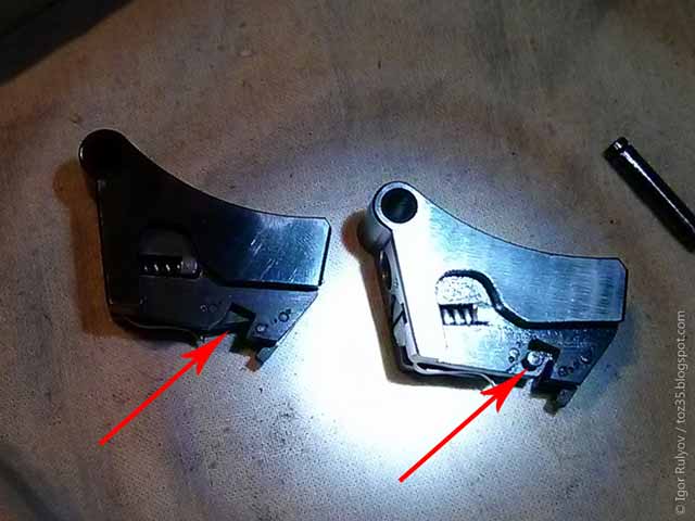 Hier war der Abzug furchtbar – sehr zufällige Abzugscharakter. Mal sehr lang, kurz, kurz, wieder sehr lang… unberechenbar. (Eine) Lösung – mittleren Hebel (Teil #23) mit einer Feile anpassen: